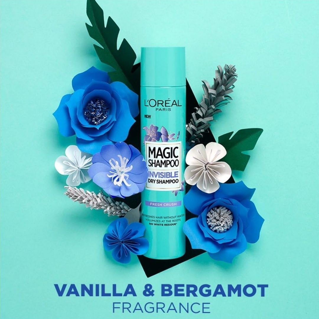 Revive your hair instantly with L'Oreal Paris Magic Shampoo Fresh Crush. This invisible dry shampoo refreshes hair between washes by absorbing excess oil without leaving white residue. With a light, fresh scent, it gives your hair a clean, voluminous look and feel—perfect for on-the-go touch-ups and busy mornings.