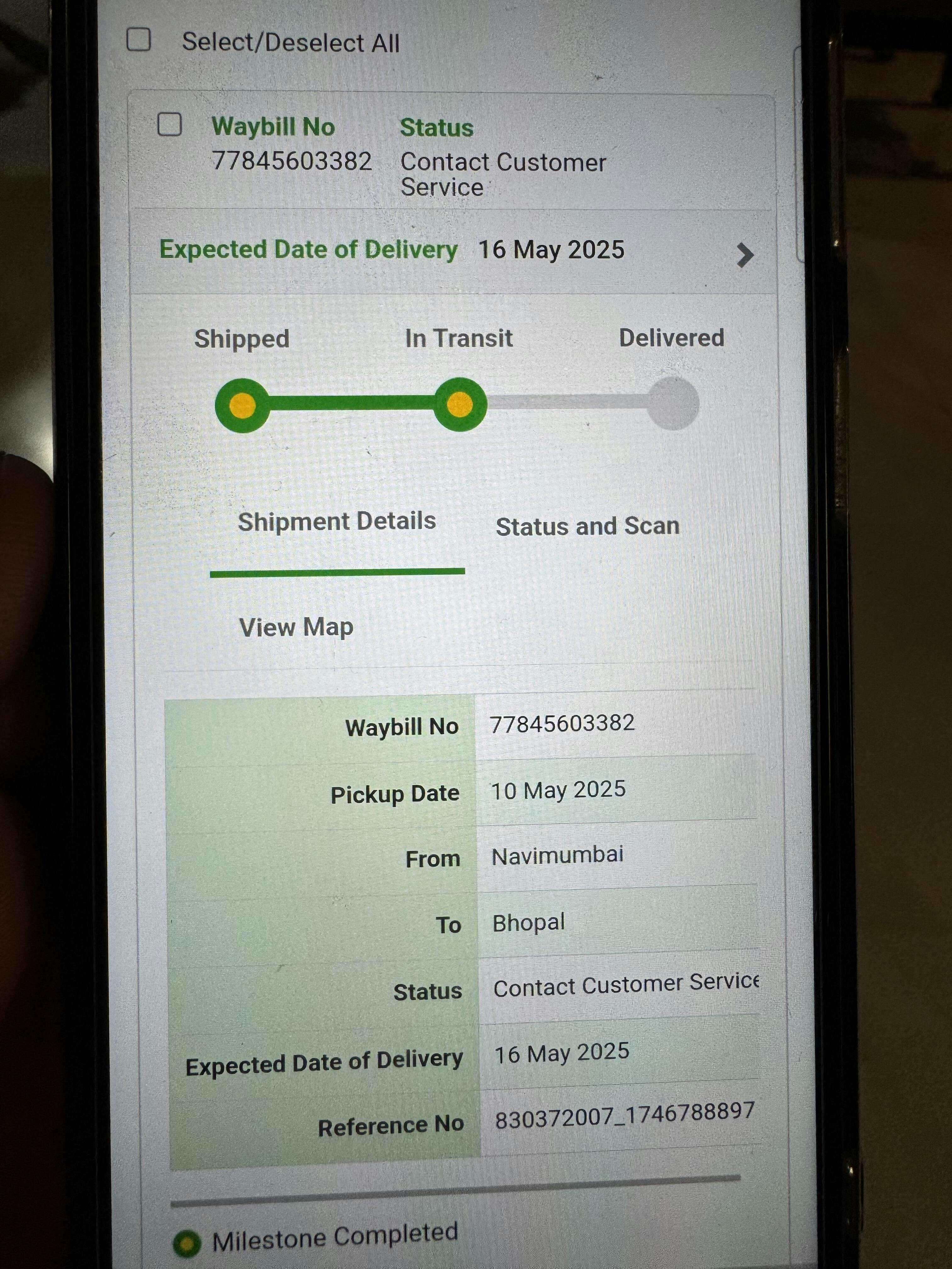 Not delivered extremely poor service by the company attached is the pic of delivery status showing 16th may delivered but above showing in transit, paid extra for delivery as needed it urgently but nothing yet
