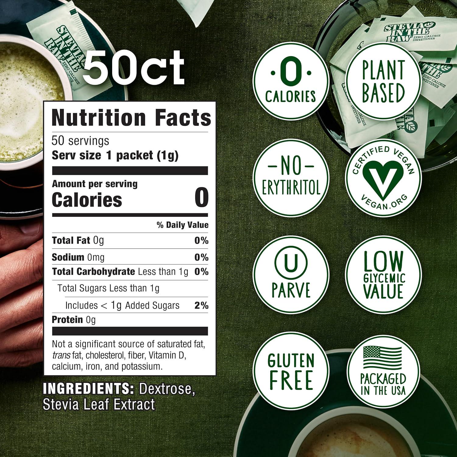 IN THE RAW Stevia In The Raw, Plant Based Zero Calorie Sweetener, Sugar Substitute, Sugar-Free Sweetener For Coffee, Hot And Cold Drinks, Suitable For Diabetics, Vegan, Gluten-Free, 50 Count Packets (Pack Of 1)