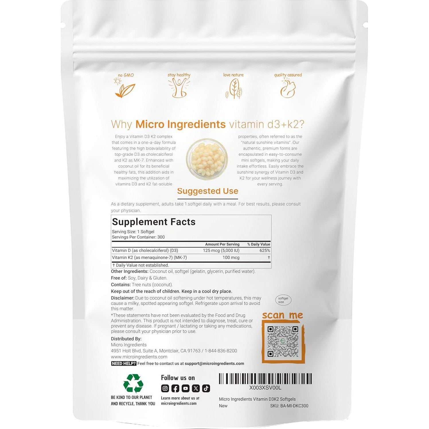 Micro Ingredients Micro Ingredients Vitamin D3 5000 IU Plus K2 (MK-7) 100 Mcg, 300 Virgin Coconut Oil Softgels | 2 In 1 Vitamins D And K Complex | Supports Calcium Absorption, Bone, Immune, And Heart Health
