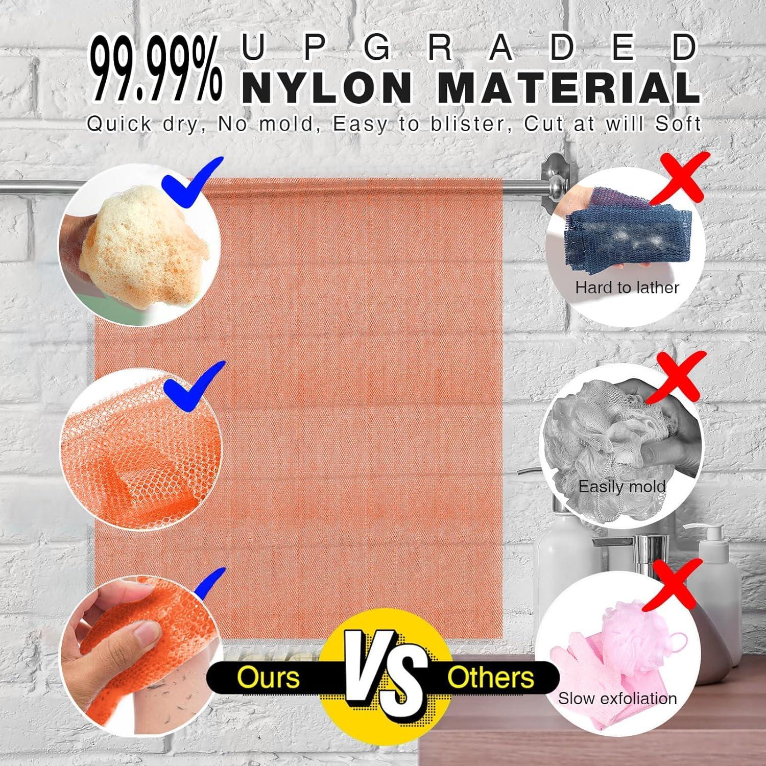 - Better quality material Our long bath net sponge is made of safe and reliable New type nylon materials, which is sturdy and reliable and reliable for long time using, Light but very powerful and also strong soap lathering, washing machine friendly, and dry quickly due to its porous nature, providing a more clean and enjoyable bathing experience.