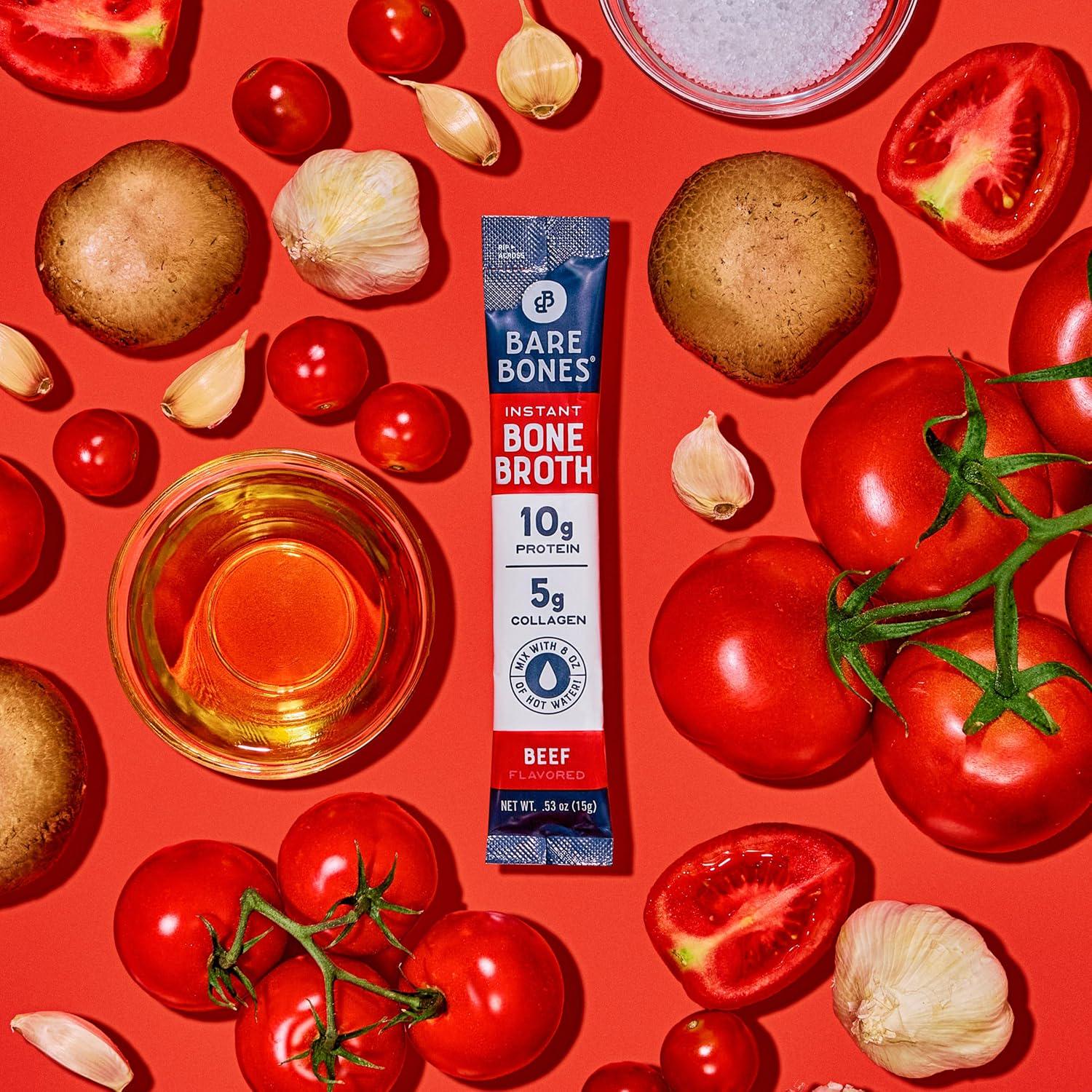 - AROMATIC DELICIOUS FLAVOR: Enjoy the taste and benefits of bone broth in convenient stick packs with Bare Bones Instant Beef Bone Broth. Made with real bone broth, grass-fed beef collagen, freshly ground herbs and spices, and more. Experience the deep, rich, savory flavor of real bone broth, crafted with quality ingredients that warm you from the inside out, wherever you are.