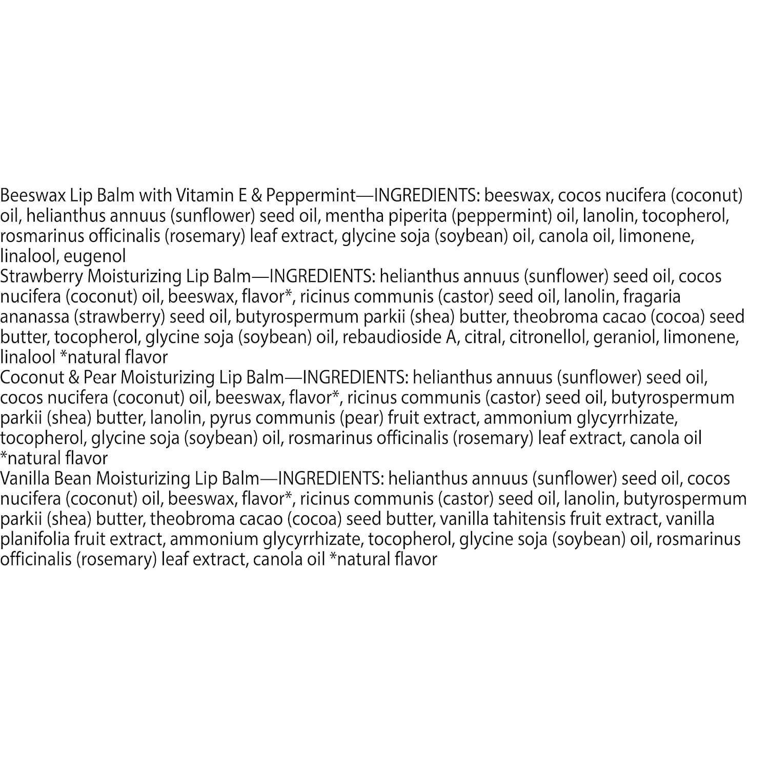 - FOUR REFRESHING FLAVORS: Delight the senses with Beeswax, Strawberry, Coconut and Pear, and Vanilla Bean flavors that will encourage you to apply flavored lip balm over and over again