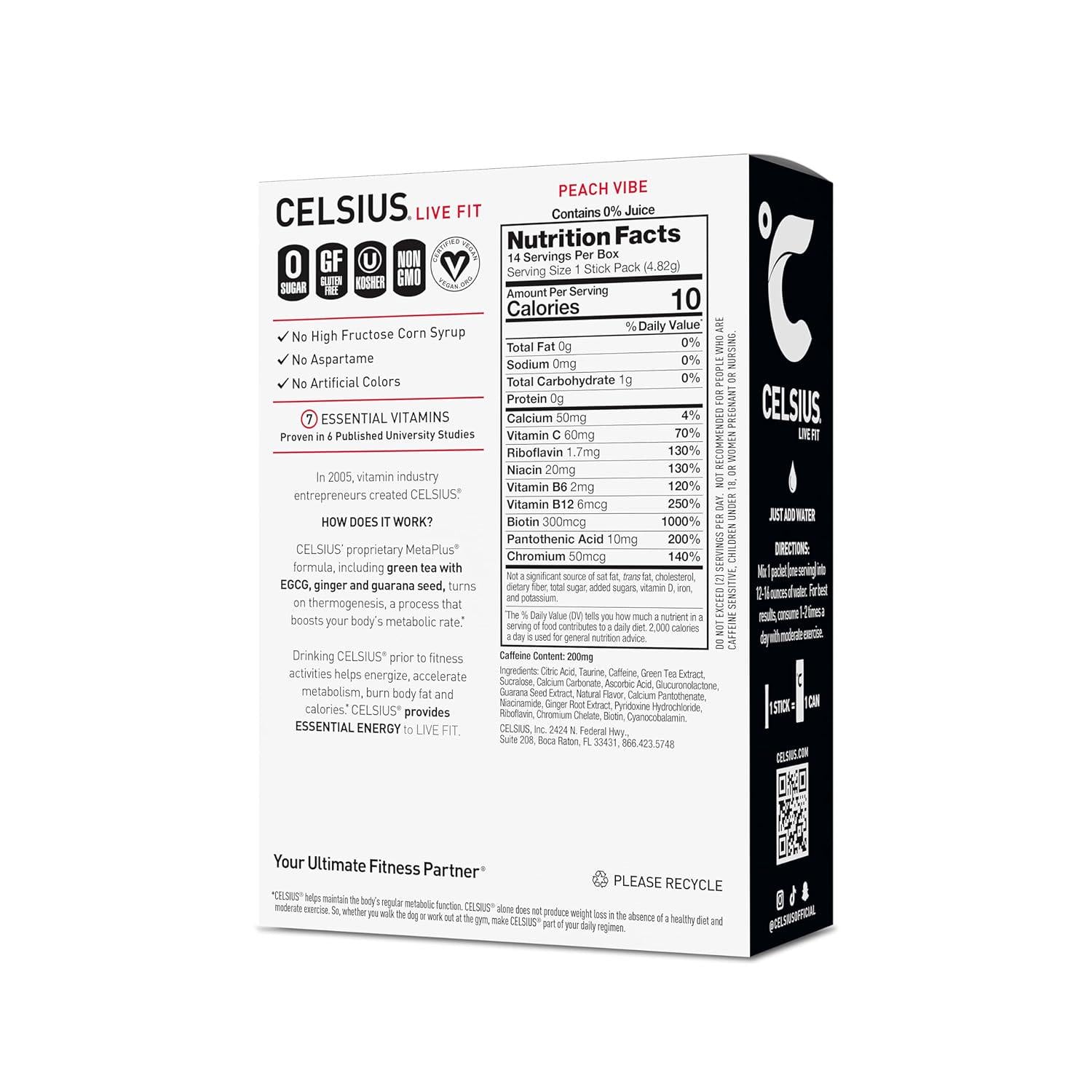 - Celsius Celsius On-the-Go Powder Sticks Peach Vibe, Essential Energy 2.6 Oz (14 Sticks Per Pack)