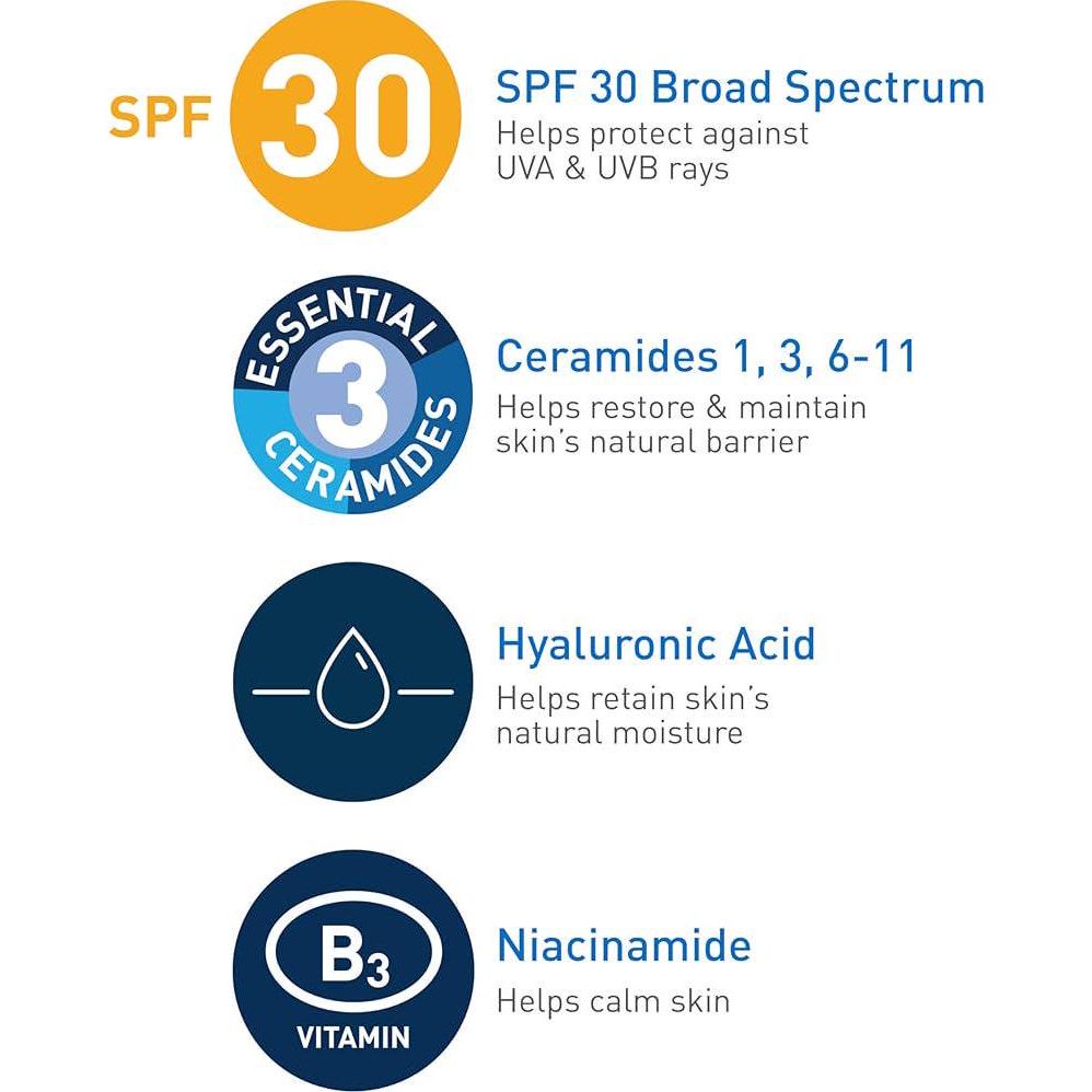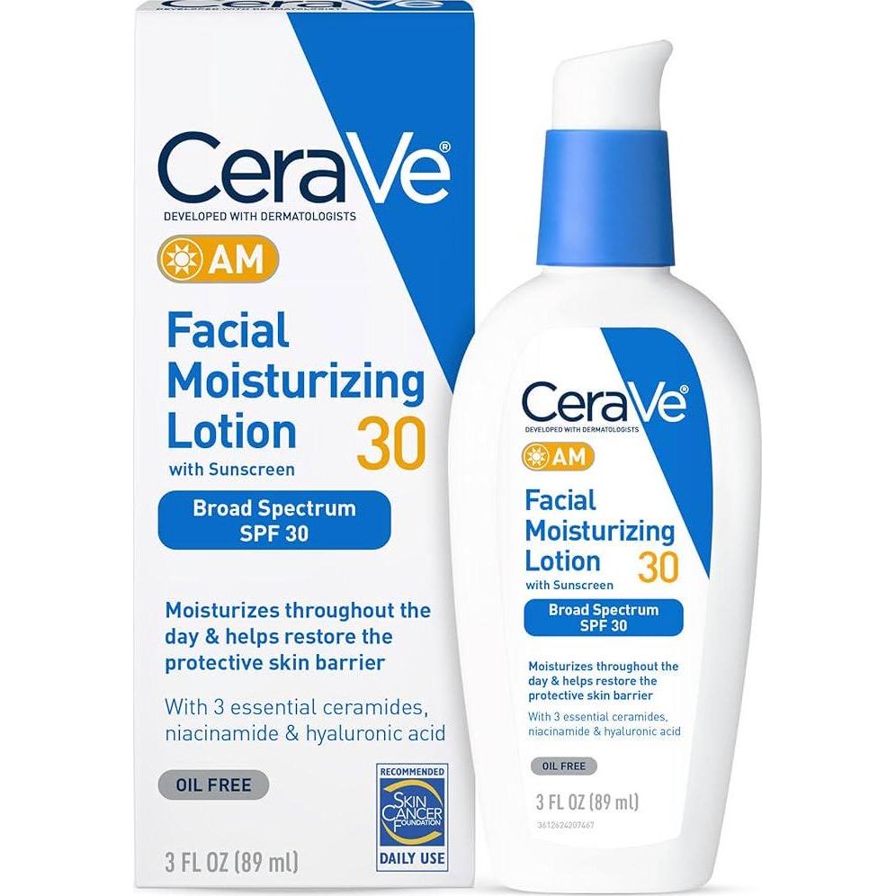 - CeraVe AM Facial Moisturizing Lotion With SPF 30, Oil-Free Face Moisturizer With SPF, Formulated With Hyaluronic Acid, Niacinamide And Ceramides, Non-Comedogenic, Broad Spectrum Sunscreen, 3 Ounce