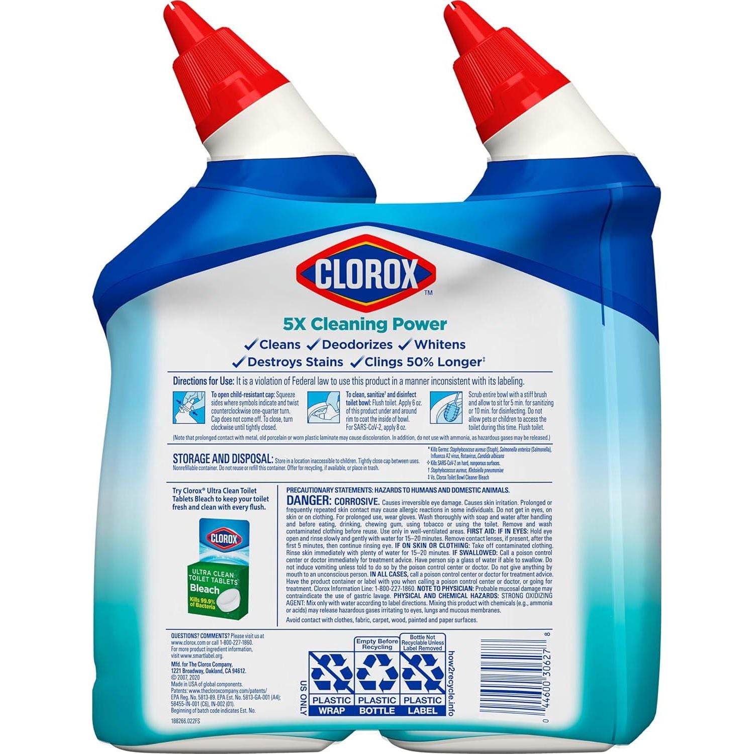 - BLEACH TOILET BOWL CLEANER: Kills 99.9% of germs, and whitens and brightens your toilet bowl with the power of Clorox Bleach and leaves a fresh Ocean Mist scent; Package may vary