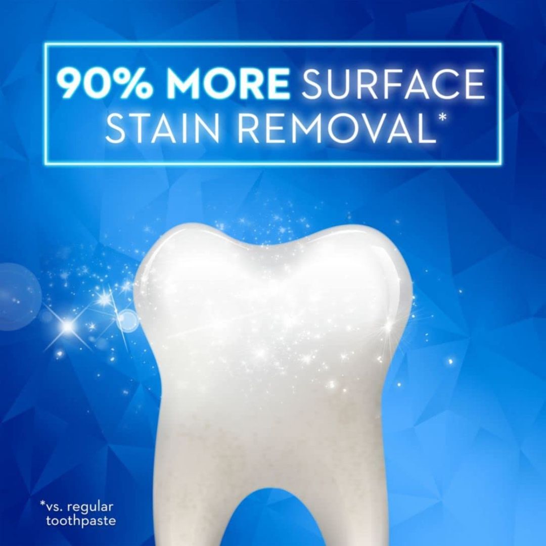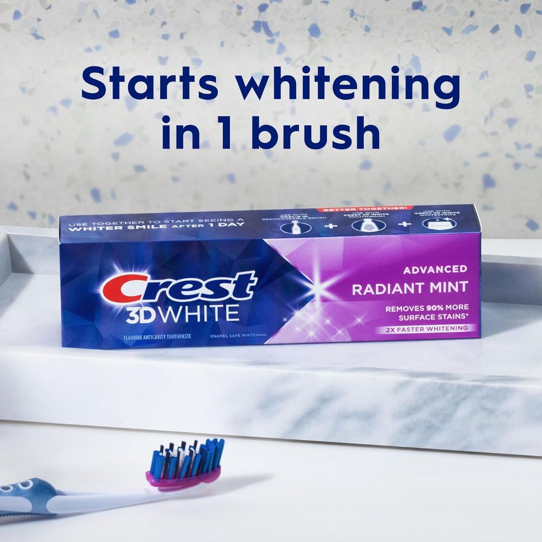 Crest 3D White Advanced Radiant Mint Fluoride Toothpaste helps reveal a visibly whiter smile by removing up to 90% of surface stains. Infused with a refreshing Radiant Mint flavor, this advanced formula strengthens enamel, fights cavities, and delivers a burst of freshness every time you brush.