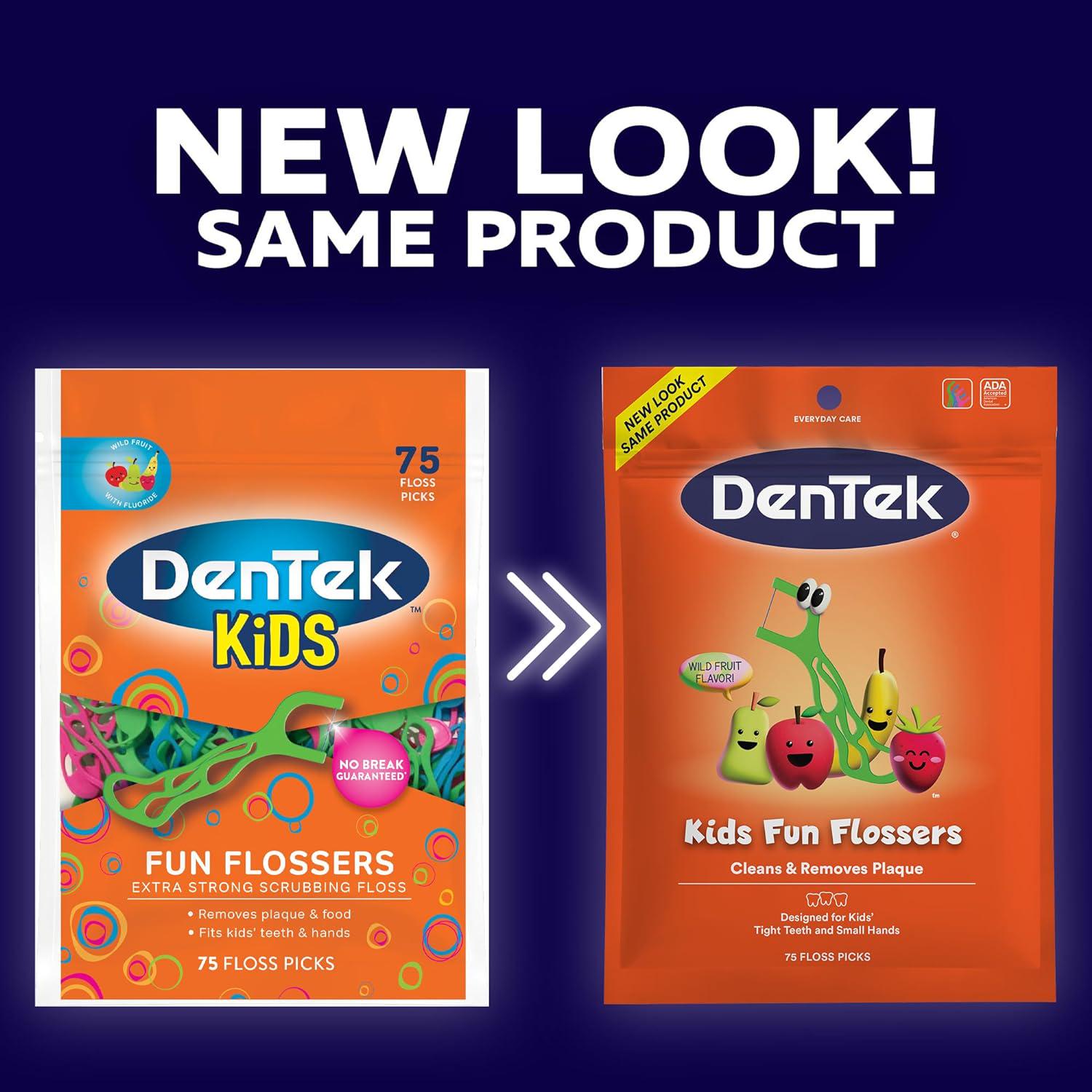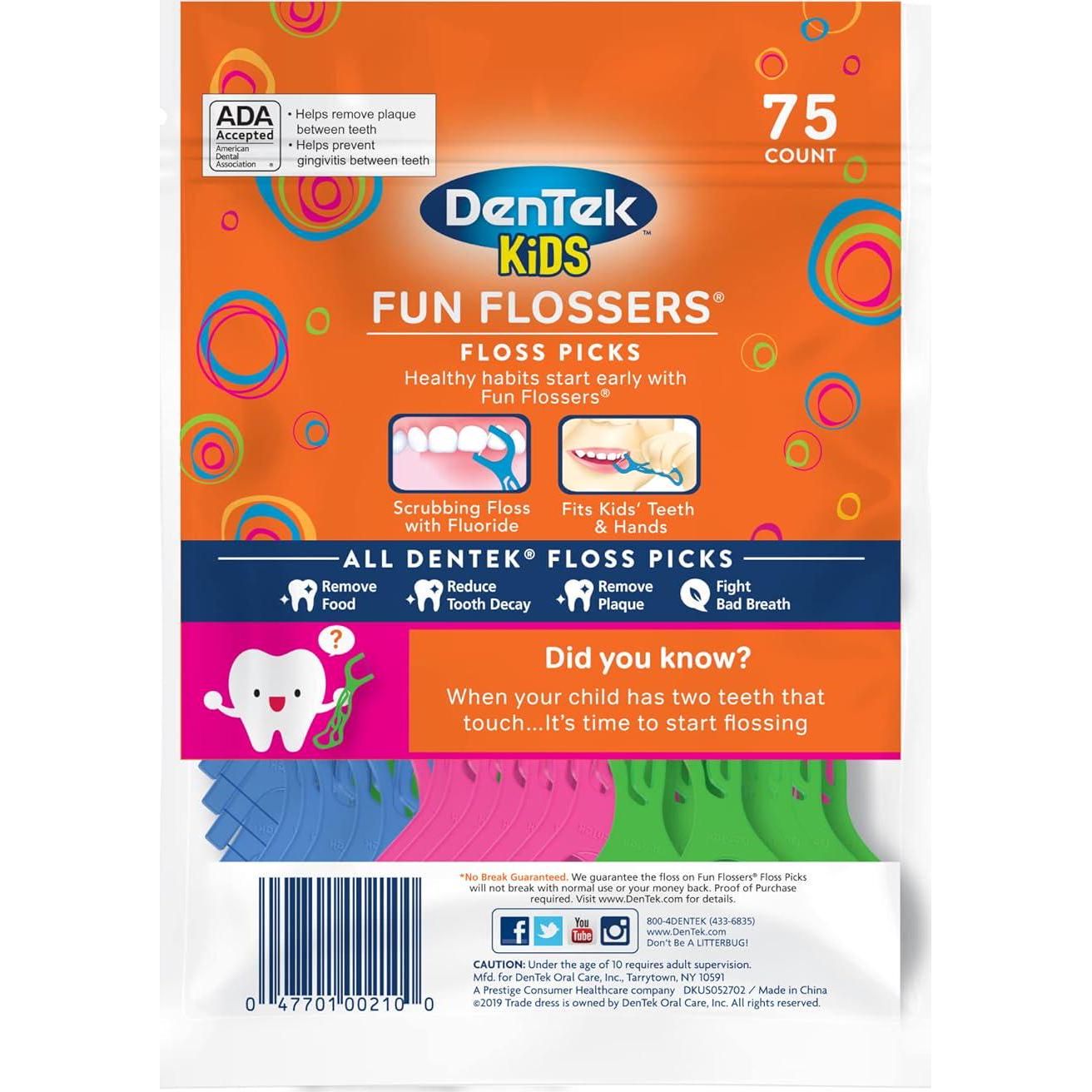 - DenTek DenTek Kids Fun Flossers, Removes Food And Plaque, 75 Count, 3 Pack