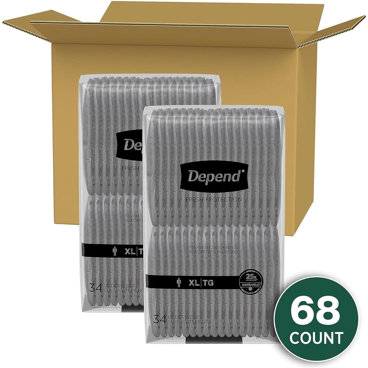 - Depend Fresh Protection Adult Incontinence Underwear for Men, Disposable, Maximum Extra Large, Grey, 68 Count (2 Packs of 34)