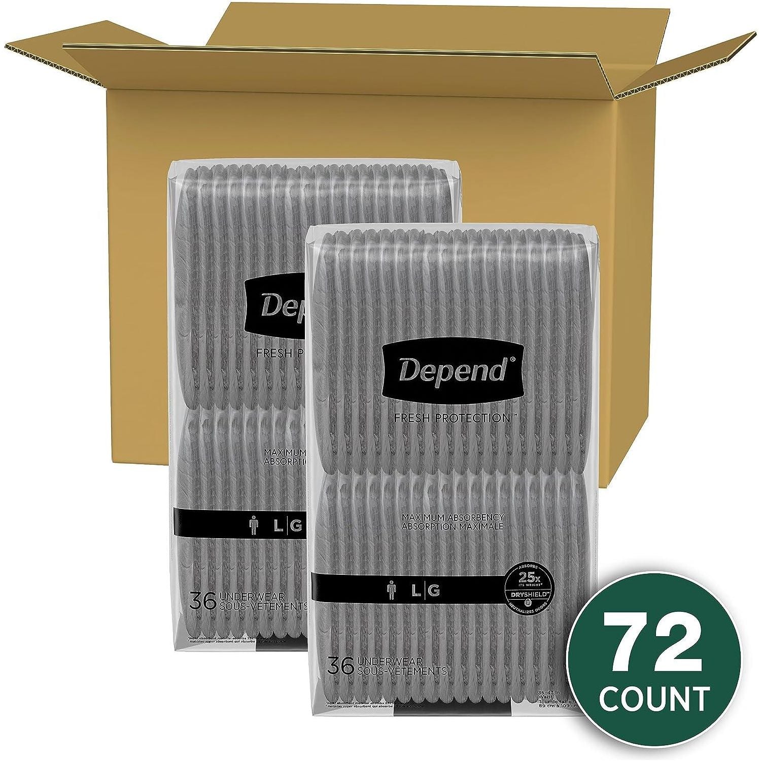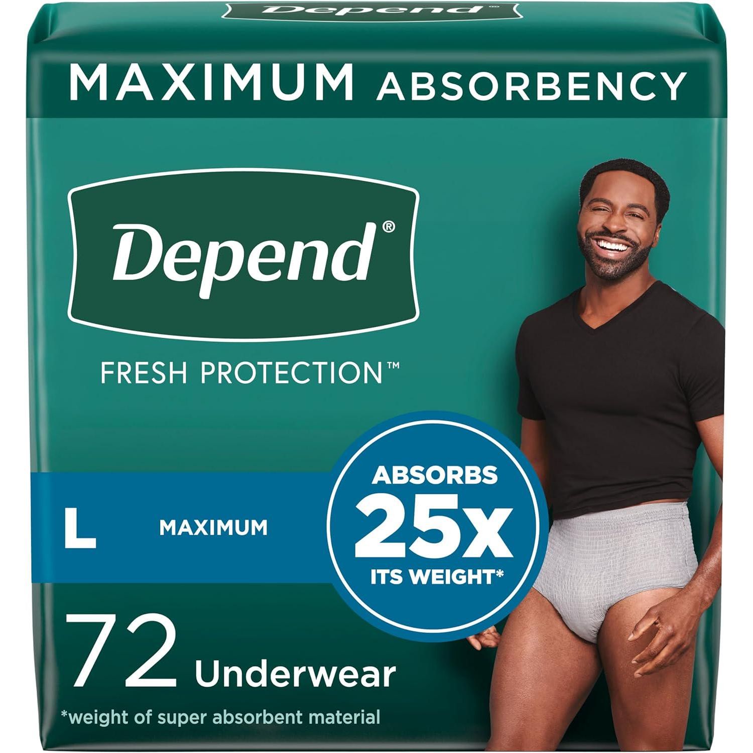 - Depend Depend Fresh Protection Adult Incontinence Underwear For Men, Disposable, Maximum, Large, Grey, 72 Count (2 Packs Of 36), Packaging May Vary