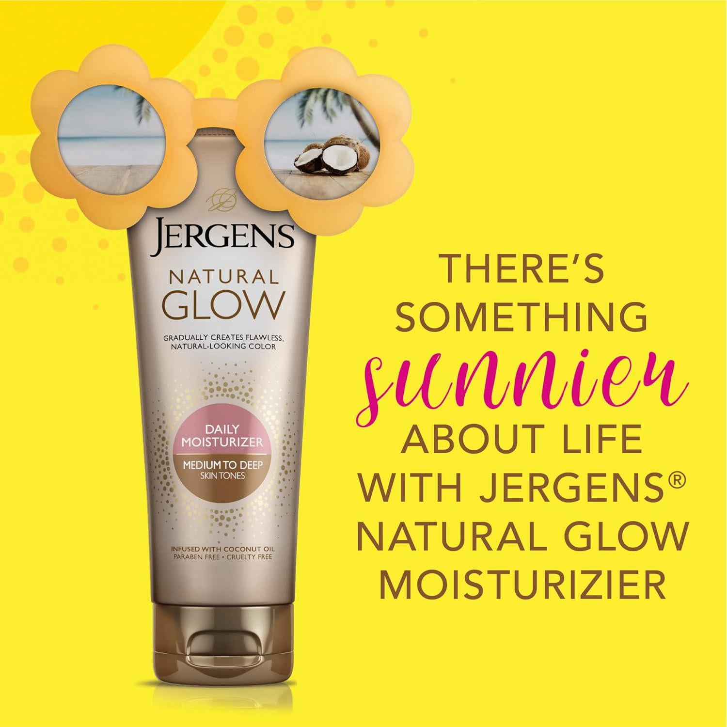 - Jergens Jergens Natural Glow Self Tanner Body Lotion, Sunless Tanning, Medium To Deep Skin Tone, Daily Moisturizer With Coconut Oil, Vitamin E And Antioxidants, 7.5 Oz