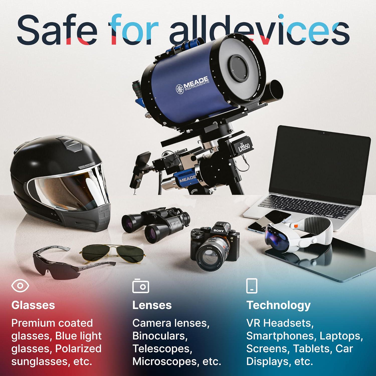 - GENTLE AND SAFE FOR ALL LENSES: Our technologically advanced eyeglass cleaning kit features an ultra-pure solution, free from alcohol, toxic chemicals, VOC's, and fragrances. Our fanatically made lens and screen cleaner spray is highly effective on all multi-coated lenses and screens, even those with advanced coatings.