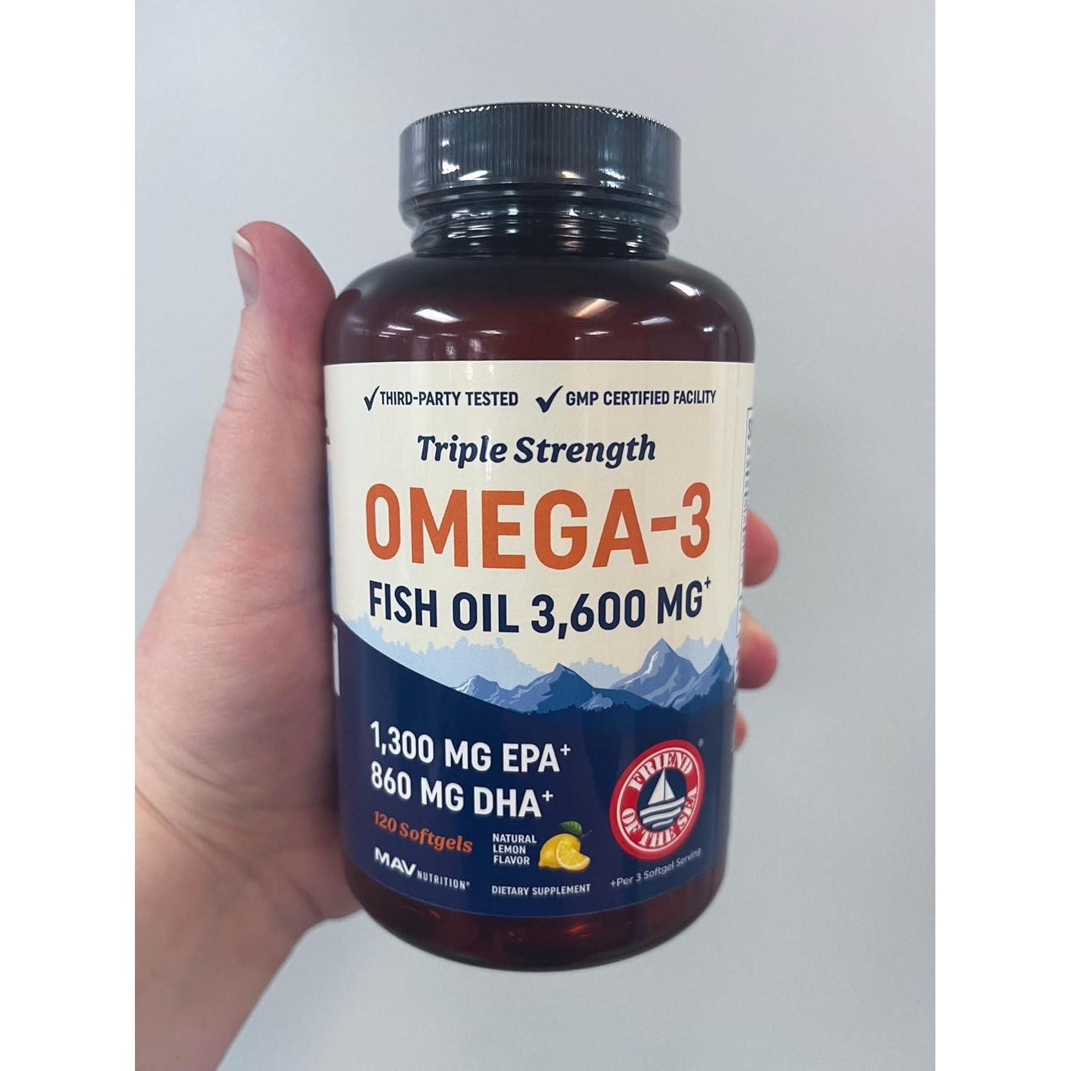 - MAV Nutrition Omega-3 Fish Oil, Triple Strength, 3,600mg, Burpless, Non-GMO, NSF Certified, 120 Count