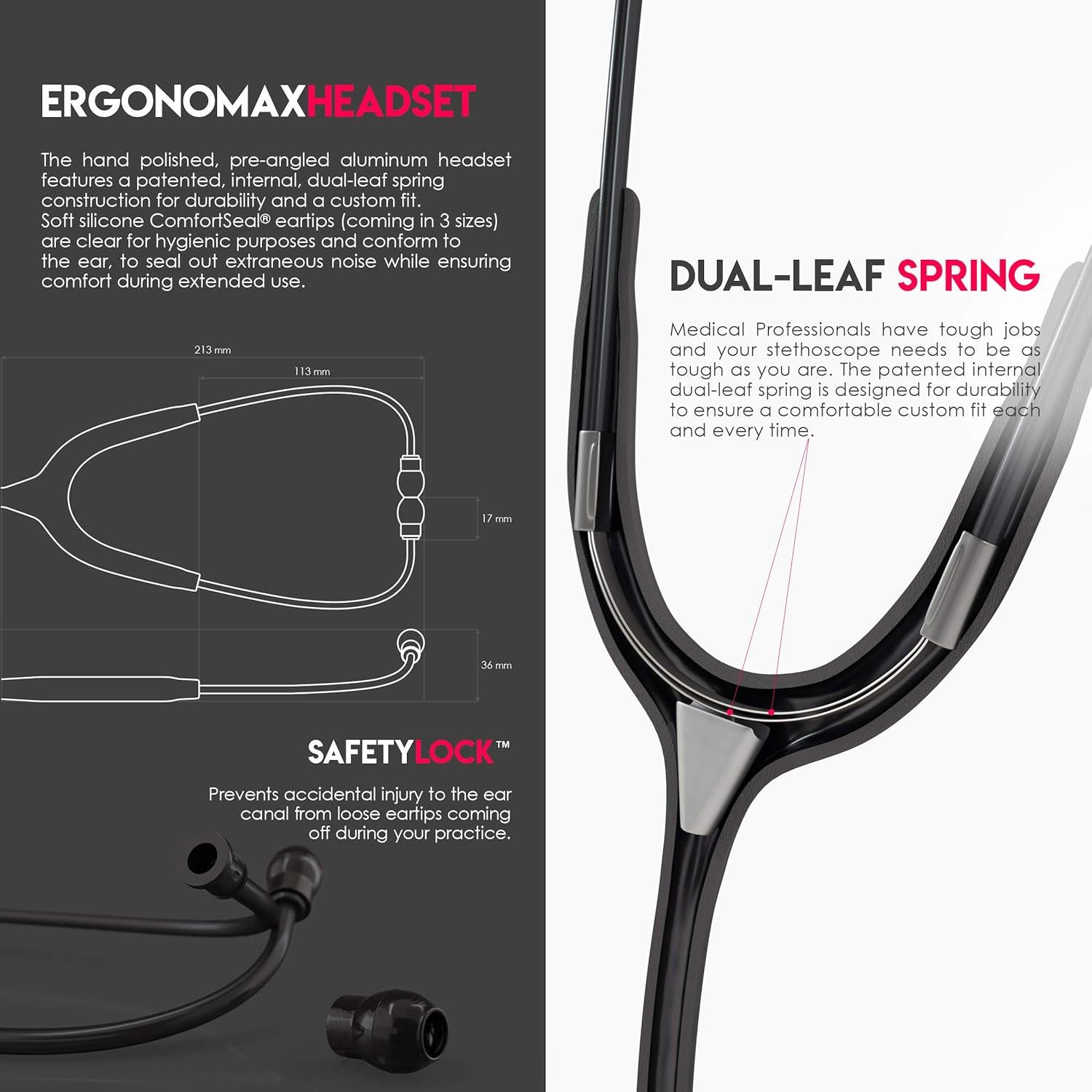 - PATENTS, HEADSET, TUBING & EARTIPS: longer, thicker and non-stick tube and ErgonoMax headset that includes a patented dual-leaf spring construction, patented Acoustic Pyramid Chamber and a patented SafetyLock Eartip adapters to maximize sound performance, durability, comfort, and extended use.