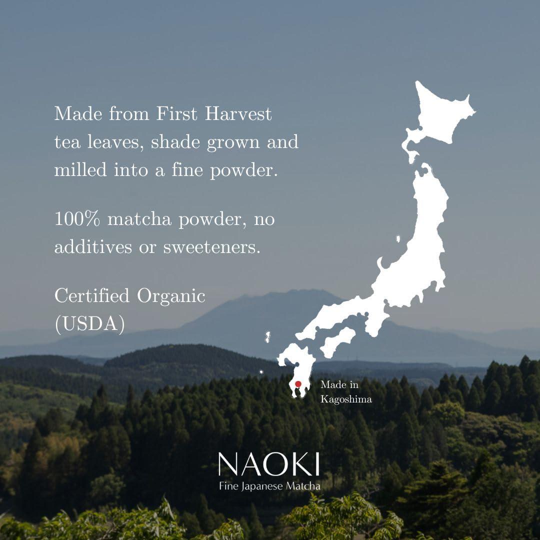 - Organic Ceremonial Grade Matcha - Certified organic by JAS (recognised by USDA). Made from the First Harvest tea leaves from the hilly Kirishima region just outside of Kagoshima city. The tea plants are shade grown, processed into tencha at modern facilities and only ground into matcha powder right before it leaves Japan for the USA.