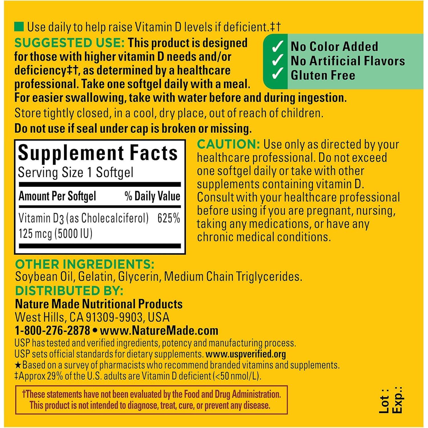 - Nature Made Extra Strength Vitamin D3, 5000 IU, 125 mcg Dietary Supplement for Bone, Teeth, Muscle & Immune Health, 180 Softgels, 180-Day Supply