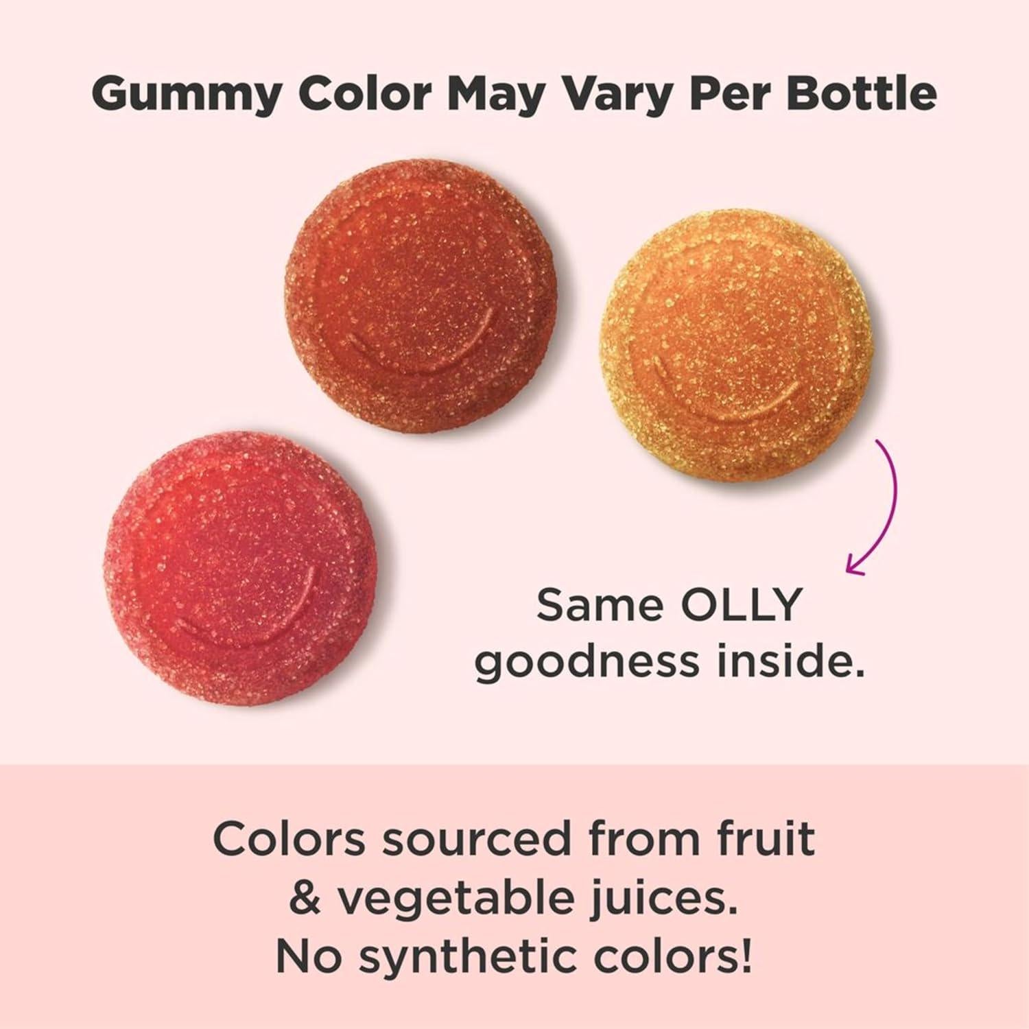 - NEW NEWS: We ve made improvements to the taste and texture of our products with the same OLLY goodness inside each gummy. Gummy color may vary per bottle. Colors sourced from fruit and vegetable juices. No synthetic colors or dyes!