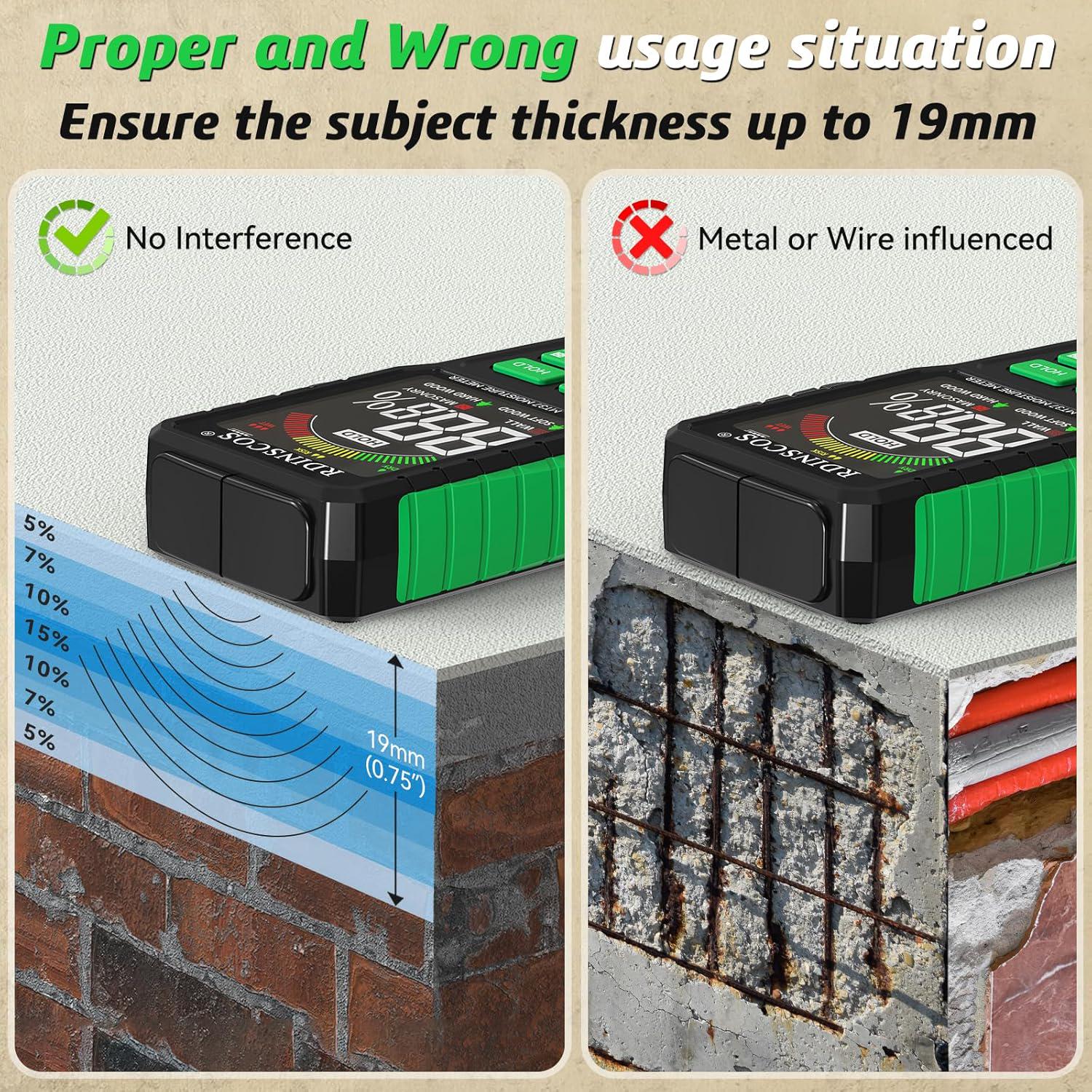- Wood Moisture Meter is designed to non-invasively detect hidden moisture content up to 3/4-Inch (19 mm) depth.