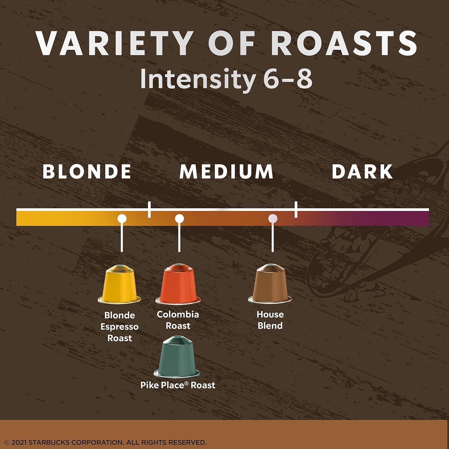 - This variety pack of Mild Starbucks Nespresso roasts includes Blonde Espresso Roast, House Blend, Single-Origin Colombia, and Pike Place Roast