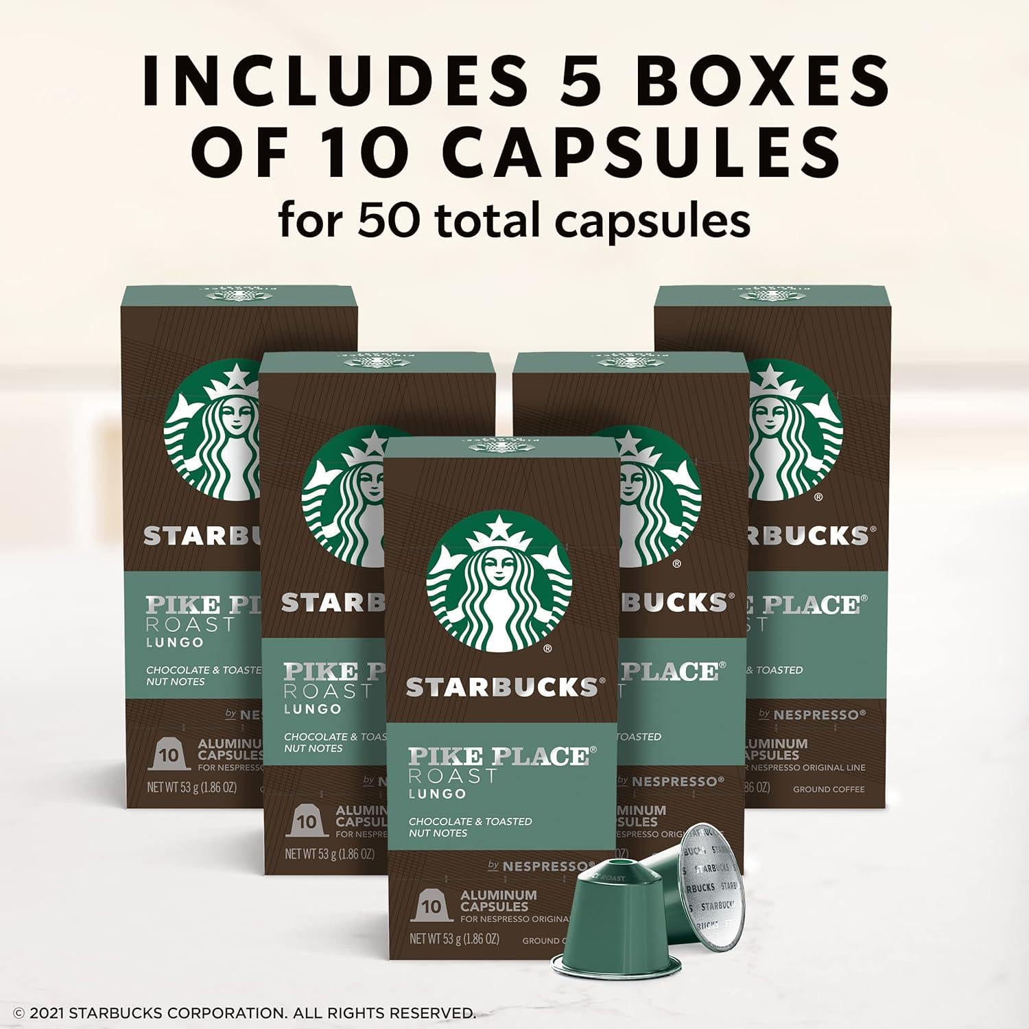 - Package contains 5 boxes of 10 Starbucks Pike Place Roast Nespresso Coffee Capsules to make up to 50 cups