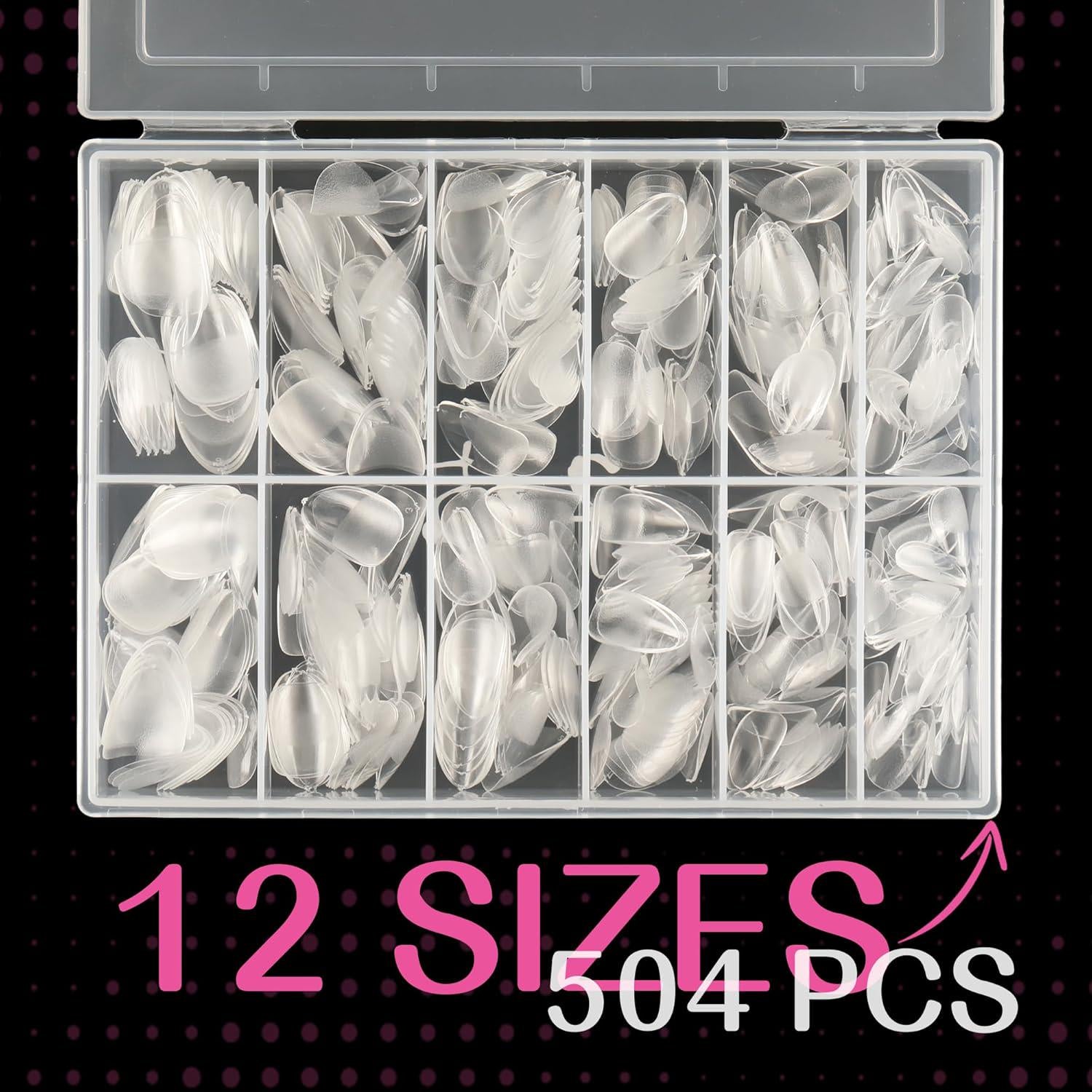 - 504 Pcs,12 Sizes, Pre-numbered - Extra short almond nail tip 504 pieces. 12 sizes, you can find the best size nail tips. The gel nail tips are marked with numbers at the top .which is very convenient for you to choose the suitable size you need. And the fake nail tips with box will provide you with convenient and tidy storage.